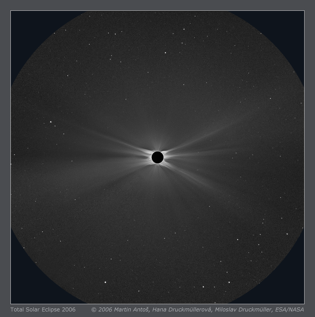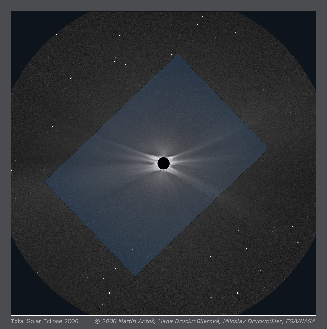 | Processing | Composition of 98 images (63 D, 35 A) and SOHO LASCO C3 image. Images were aligned by means of phase correlation, composed using of LDIC 4.0 software, processed using Corona 4.0 in order to visualize coronal structures. Final processing was done using ACC 6.0 software. Image processing by Miloslav Druckmüller and Hana Druckmüllerová |