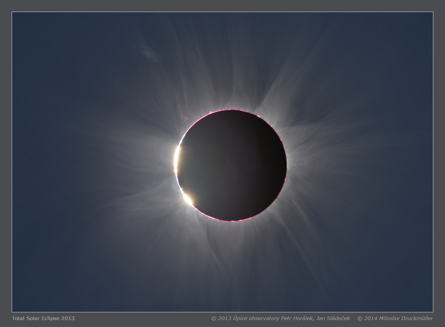 | Processing | Composition of 23 eclipse images. Eclipse images were calibrated by means of large number of dark frames and flat-fields, aligned by means of phase correlation, composed by means of LDIC 5.0 software, processed using Corona 4.1 in order to visualize coronal structures. Final processing was done using ACC 6.1 software. Image processing by Miloslav Druckmüller |