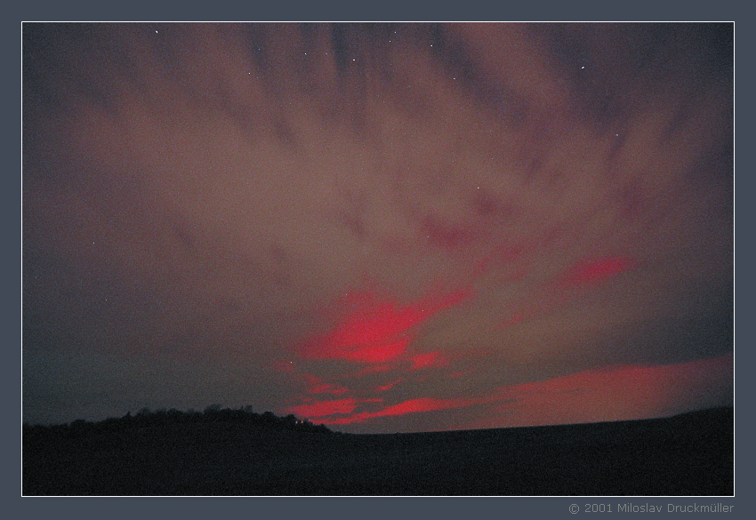 ![]() Obr 1. 23:20 LČ Zpočátku dobré pozorovací podmínky se začaly rychle zhoršovat a v 00:00 LČ bylo již téměř úplně zataženo. V tuto dobu se objevila mimořádně jasná červená polární záře viditelná na SZ několika menšími dírami v jinak souvislé oblačnosti (obr. 2.).
