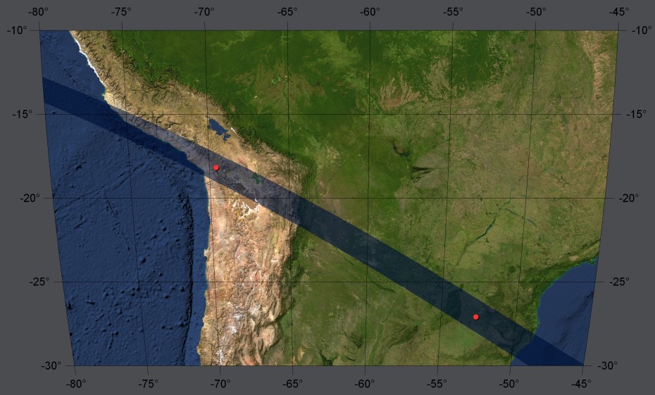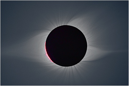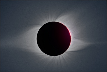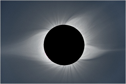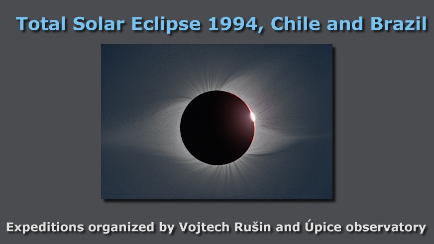 Two sets of photographs were used for creation of images presented on this page. The first set consists of color slides and it was taken in Chile by Vojtech Rušin. The inner corona is very well recorded on these slides but only up to the distance of about 0.7 solar radii. The outer part of corona was fortunately well recorded by Úpice observatory expedition led by Eva Marková. They took set of B&W images which I used to improve contrast in the distant part of corona. The most critical step of processing was precise alignment of images with different scale and orientation. These alignment was done by means of phase correlation technique based on Fourier transform. The time delay between the sets of images was rather long - about 23 minutes but in the outer part of corona there were no features which could to be supposed fast moving. Therefore the composition of both sets of images didn't cause resulting image blurring.