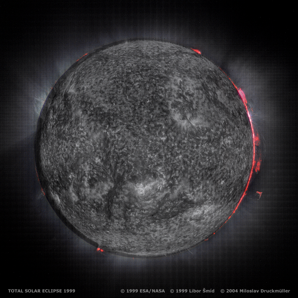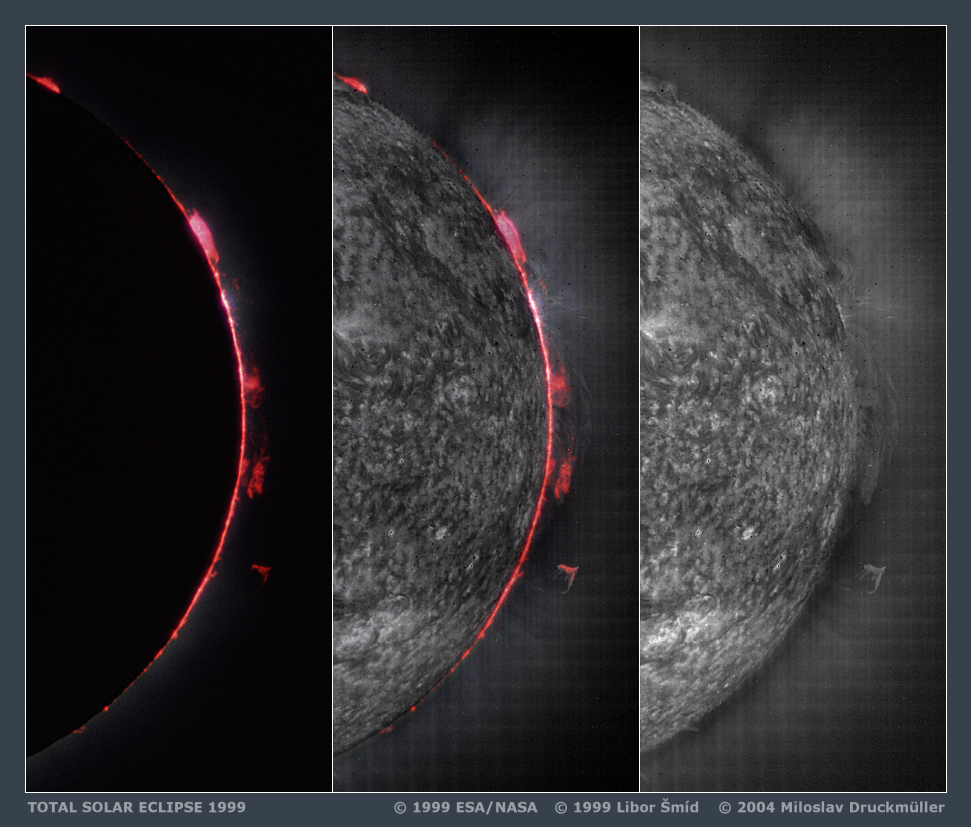 | Processing | Original color image of the prominences and the chromosphere (left) taken several seconds before the third contact was with subpixel precision matched with SOHO EIT 30.4 nm He II image (right) taken at 11:14 UT and finally composite was made (middle). Image processing by Miloslav Druckmüller |
