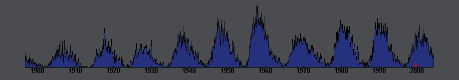 NoteThe graph above the table shows the average values of the relative number of sunspots in which the red arrow indicates the time of 1999 eclipse. Graph was created according to data from Sunspot Index Data Center, Brussels.