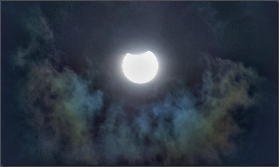 Rainbow colored cirrus clouds at the beginning of eclipse partial phase were beautiful but their beauty