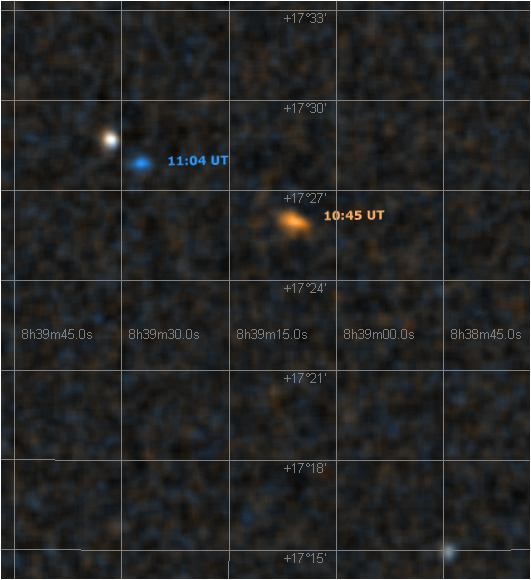 Sungrazing cometAccording to MPEC 2008-O67, the comet was 1.04 AU far from us and only 0.05 AU far from the solar center during our observation. The bright star near the comet is of 8.3 magnitude and has coordinate J2000 RA: 8h39m31.51s, DE: +17°28'41.5" (TYC1392-00854-1 Tycho 2 catalogue). The second little bit fainter star at the bottom right is of 9.0 magnitude and its coordinate are J2000 RA: 8h38m44.19s, DE: +17°14'56.5" (TYC1392-00425-1 Tycho 2 catalogue). See the image with coordinate grid. You may see the comet images taken in Russia and Mongolia also in the form of animations with wider and narrower field of view. Acknowledgement I identified the comet thanks to information from Michal Kusiak, Martin Mašek and Dalibor Hanžl.
