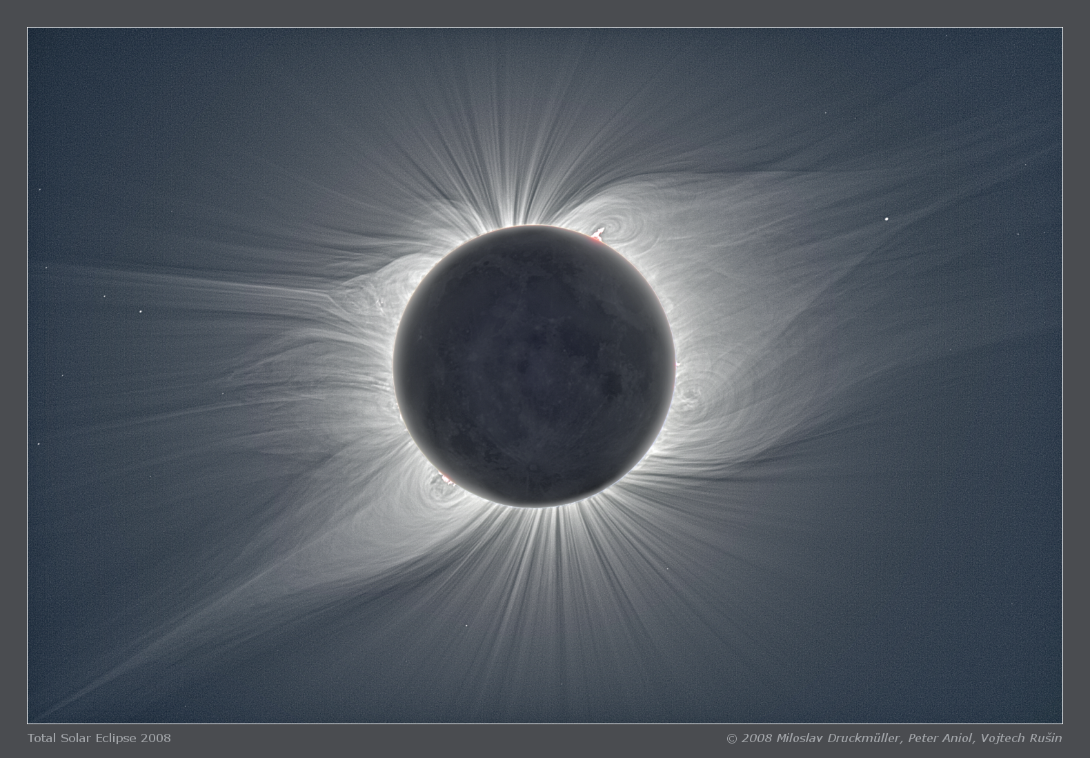 | Processing | Composition of 23 images. Eclipse images calibrated by means of dark frames and flat-fields, aligned by means of phase correlation, composed by means of LDIC 5.0 software, processed using Corona 4.1 in order to visualize coronal structures. Final processing was done using ACC 6.1 software. Image processing by Miloslav Druckmüller |