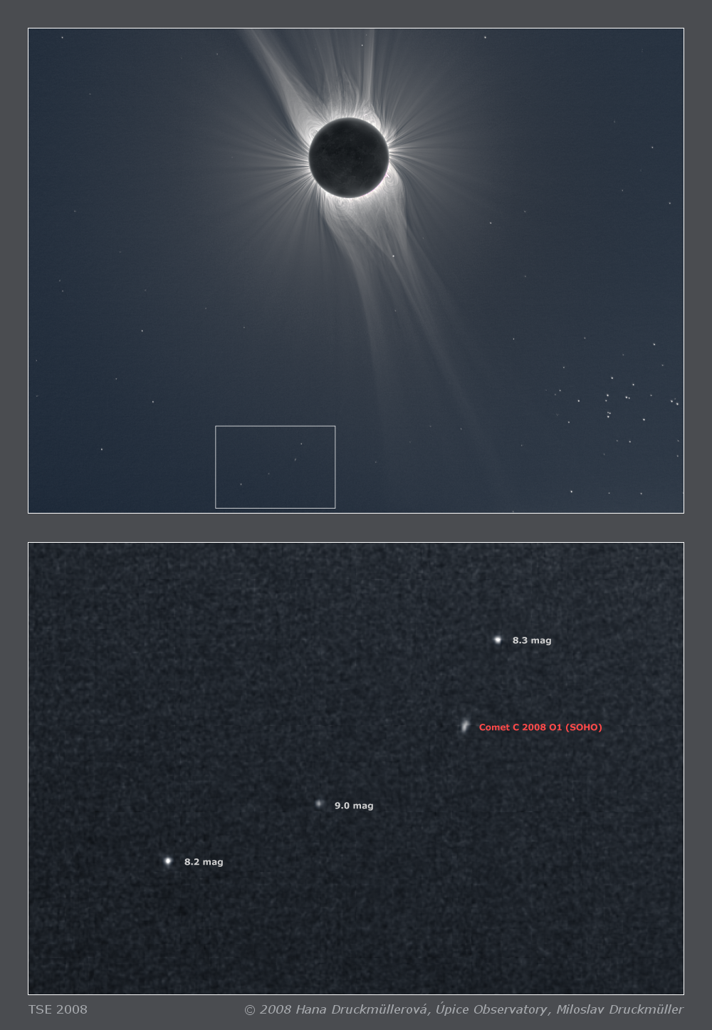 This image illustrates excellent observing conditions in Klyuchi during the total solar eclipse. It is possible to identify at least 137 stars including the open cluster M 44 Praesepae (NGC 2632), which is visible in the bottom right image corner. The sungrazing comet C/2008 O1 (SOHO) is a very interesting object which is visible in the lower part of the image. The comet belongs to the Kreutz family. The comet was found not only on images taken from Klyuchi but also on images taken by the second part of our expedition in Mongolia. See this page for more information.