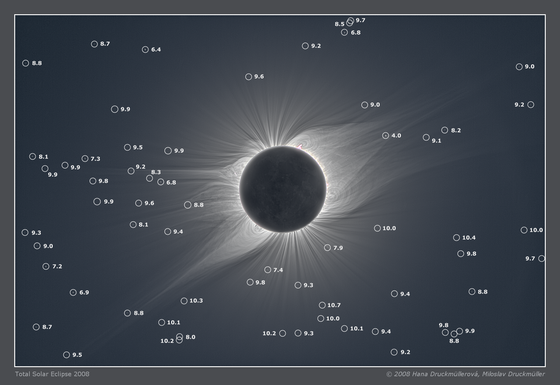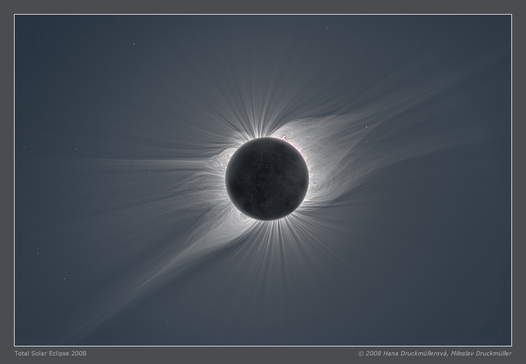 | Processing | Composition of 56 images. Eclipse images calibrated by means of dark frames and flat-fields, aligned by means of phase correlation, composed by means of LDIC 5.0 software, processed using Corona 4.1 in order to visualize coronal structures. Final processing was done using ACC 6.1 software. Image processing by Hana Druckmüllerová and Miloslav Druckmüller |