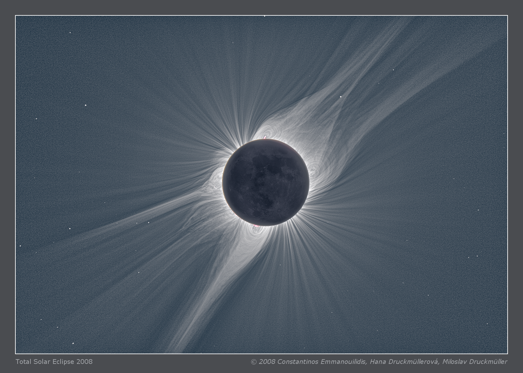 | Processing | Composition of 31 images. Eclipse images calibrated by means of dark frames and flat-fields, aligned by means of phase correlation, composed by means of LDIC 5.0 software, processed using Corona 4.1 in order to visualize coronal structures. Final processing was done using ACC 6.1 software. Image processing by Hana Druckmüllerová and Miloslav Druckmüller |