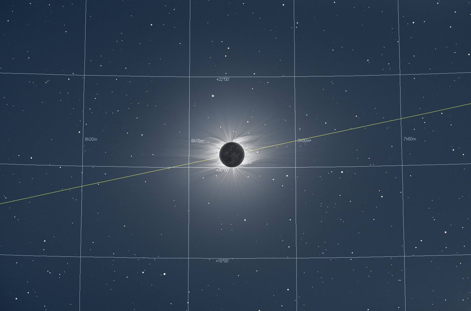 | Processing | Composition of 9 images (Canon 200mm lens) and 38 (Maksutov-Cassegrain) eclipse images. Eclipse images calibrated by means of dark frames and flat-fields, aligned by means of phase correlation, composed by means of LDIC 5.0 software, processed using Corona 4.1 in order to visualize coronal structures. Final processing was done using ACC 6.1 software. Image processing by Miloslav Druckmüller |
