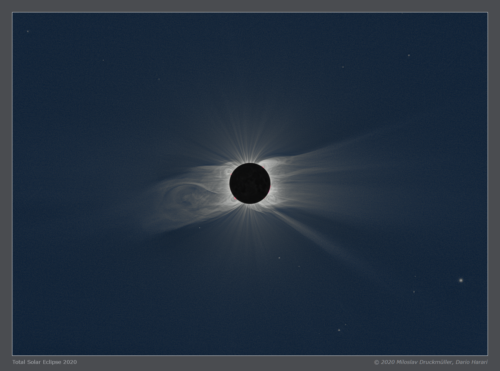 | Processing | Composition of 137 eclipse images. Eclipse images were calibrated by means of dark frames and flat-fields, aligned by means of phase correlation, composed by means of LDIC 6.0 software, processed using Corona 6.0 in order to visualize coronal structures. Final processing was done using ACC 6.1 software. Image processing by Miloslav Druckmüller Images acquired by Dario Harari |