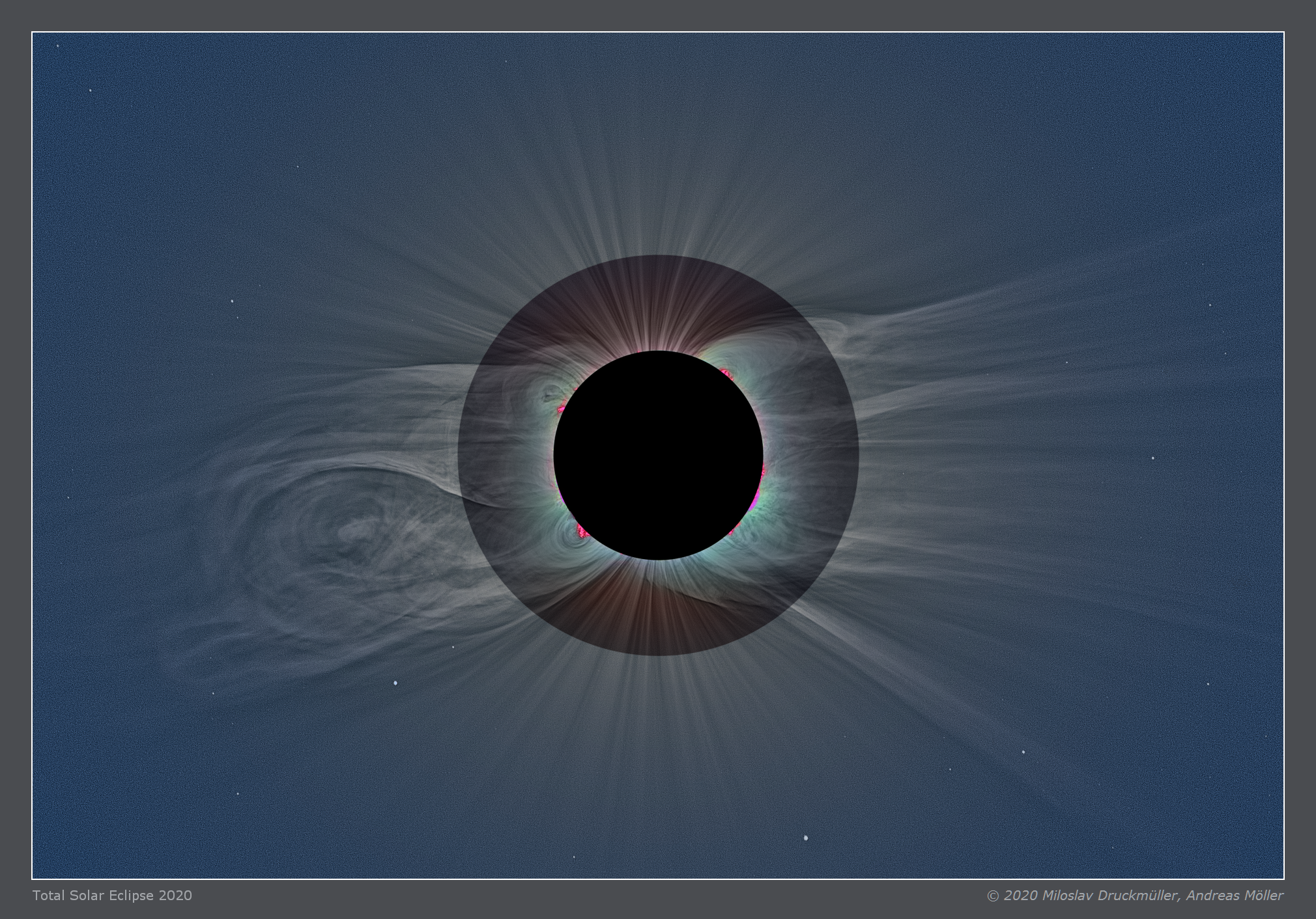 | Processing | Composition of 55 eclipse images. Eclipse images were calibrated by means of dark frames and flat-fields, aligned by means of phase correlation, composed by means of LDIC 6.0 software, processed using Corona 6.0 in order to visualize coronal structures. Final processing was done using ACC 6.1 software. Image processing by Miloslav Druckmüller Eclipse images acquired by Andreas Möller |