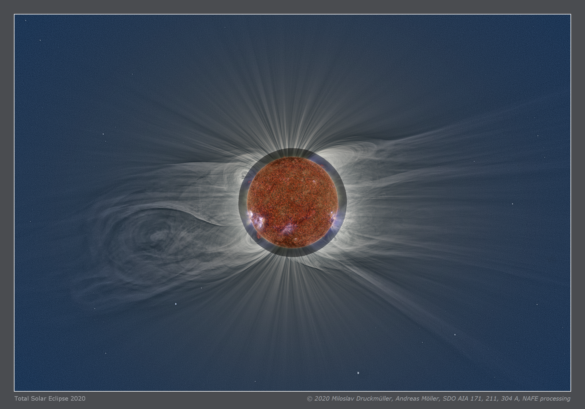| Processing | Composition of 55 eclipse images. Eclipse images were calibrated by means of dark frames and flat-fields, aligned by means of phase correlation, composed by means of LDIC 6.0 software, processed using Corona 6.0 in order to visualize coronal structures. Final processing was done using ACC 6.1 software. Image processing by Miloslav Druckmüller Eclipse images acquired by Andreas Möller |