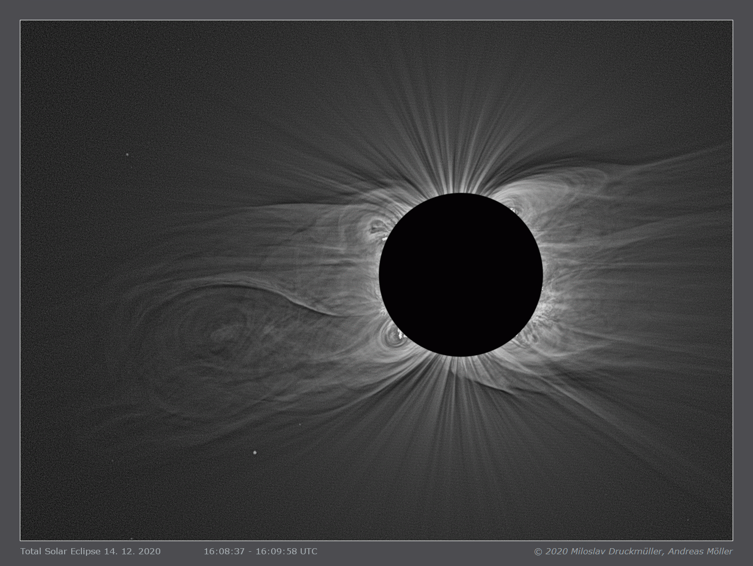 | Processing | Composition of 55 eclipse images. Eclipse images were calibrated by means of dark frames and flat-fields, aligned by means of phase correlation, composed by means of LDIC 6.0 software, processed using Corona 6.0 in order to visualize coronal structures. Final processing was done using ACC 6.1 software. Image processing by Miloslav Druckmüller Images acquired by Andreas Möller |