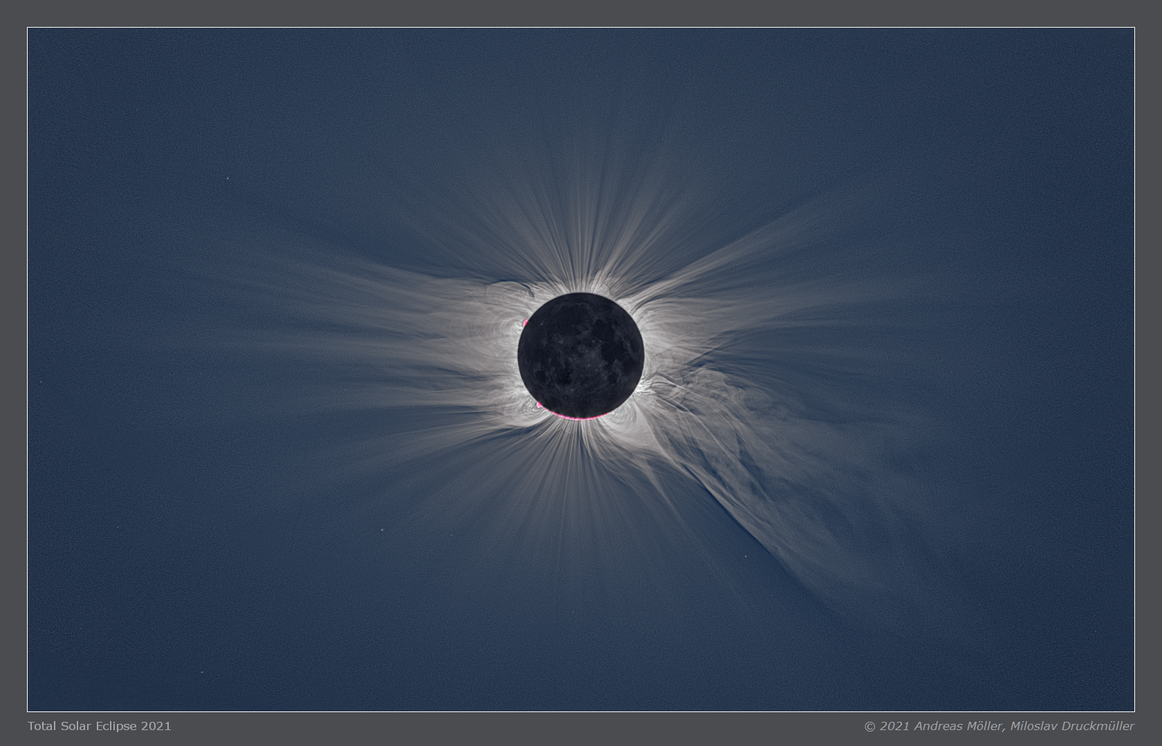 | Processing | Composition of 24 eclipse images. Eclipse images were calibrated by means of dark frames and flat-fields, aligned by means of phase correlation, composed by means of LDIC 6.0 software, processed using Corona 6.0 in order to visualize coronal structures. Final processing was done using ACC 6.1 software. Image processing by Miloslav Druckmüller Images acquired by Andreas Möller |