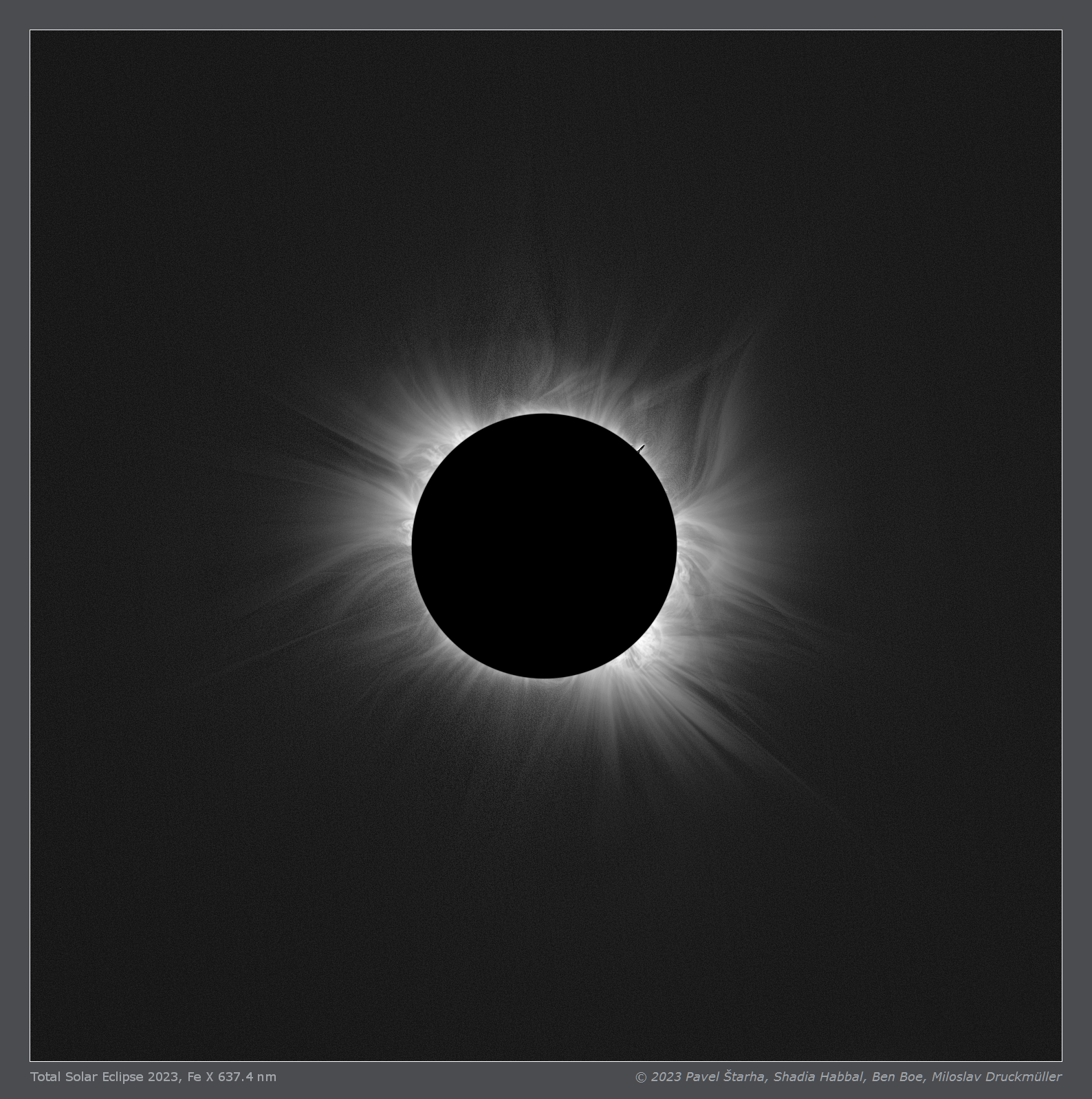 | Processing | Composition of 74 eclipse images (37 on-band and 37 off-band) taken with two cameras. Images were calibrated by means of dark frames and flat-fields, aligned by means of phase correlation, composed by means of LDIC 6.0 software, continuum was removed from Fe X emission by subtracting the off-band images. The resulting image was processed using Corona 5.0 software in order to visualize coronal structures. The final processing was done using ACC 6.1 software. Image processing by Miloslav Druckmüller |