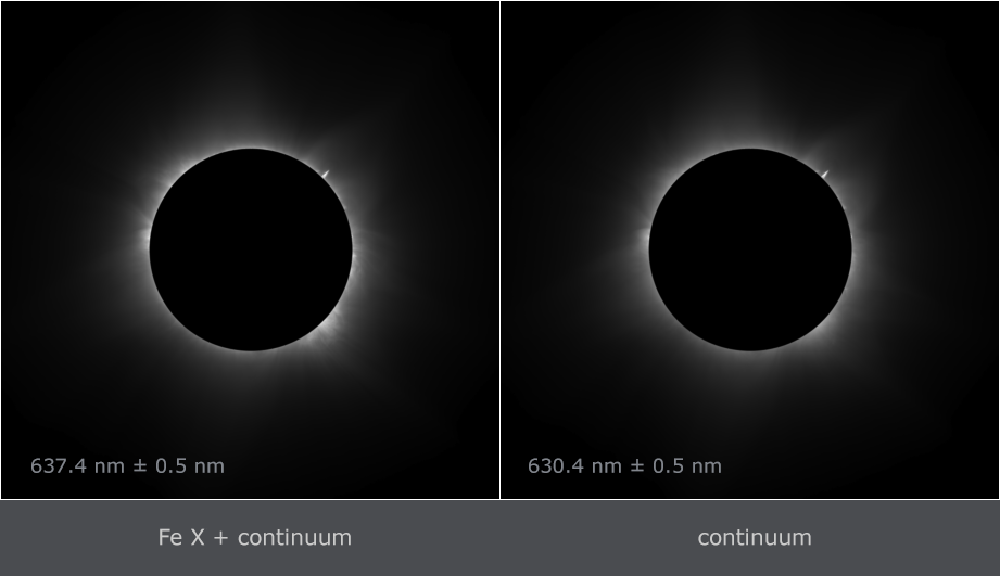Fe X 637.4 nm emission line. The right image was taken through a filter with transmission band