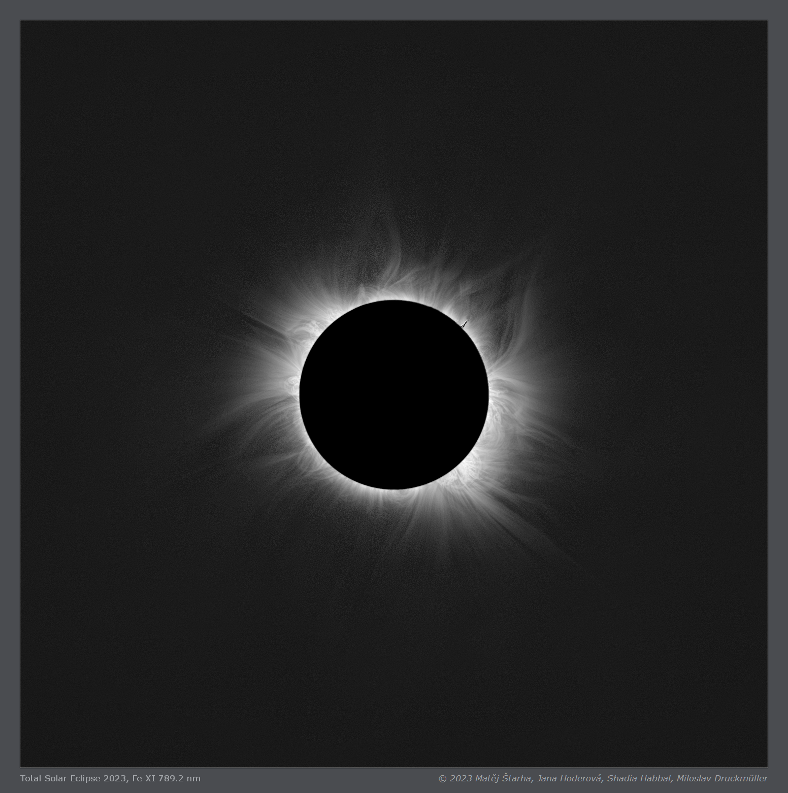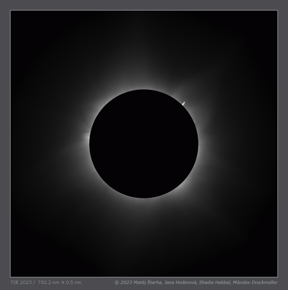 | Processing | Composition of 74 eclipse images (37 on-band and 37 off-band) taken with two cameras. Images were calibrated by means of dark frames and flat-fields, aligned by means of phase correlation, composed by means of LDIC 6.0 software, continuum was removed from Fe XI emission by subtracting the off-band images. The resulting image was processed using Corona 5.0 software in order to visualize coronal structures. The final processing was done using ACC 6.1 software. Image processing by Miloslav Druckmüller |