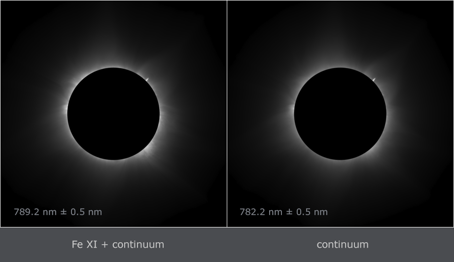 Fe XI 789.2 nm emission line. The right image was taken through a filter with transmission band