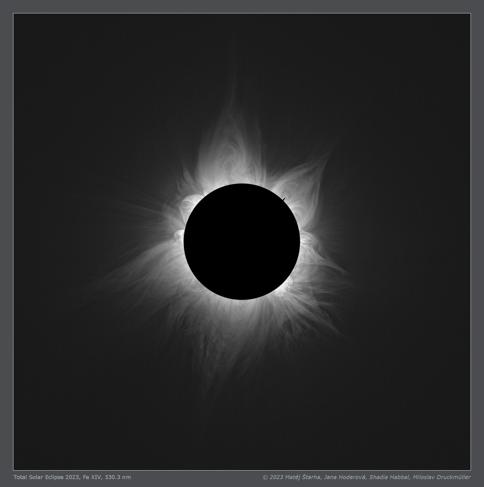 | Processing | Composition of 74 eclipse images (37 on-band and 37 off-band) taken with two cameras. Images were calibrated by means of dark frames and flat-fields, aligned by means of phase correlation, composed by means of LDIC 6.0 software, continuum was removed from Fe XIV emission by subtracting the off-band images. The resulting image was processed using Corona 5.0 software in order to visualize coronal structures. The final processing was done using ACC 6.1 software. Image processing by Miloslav Druckmüller |