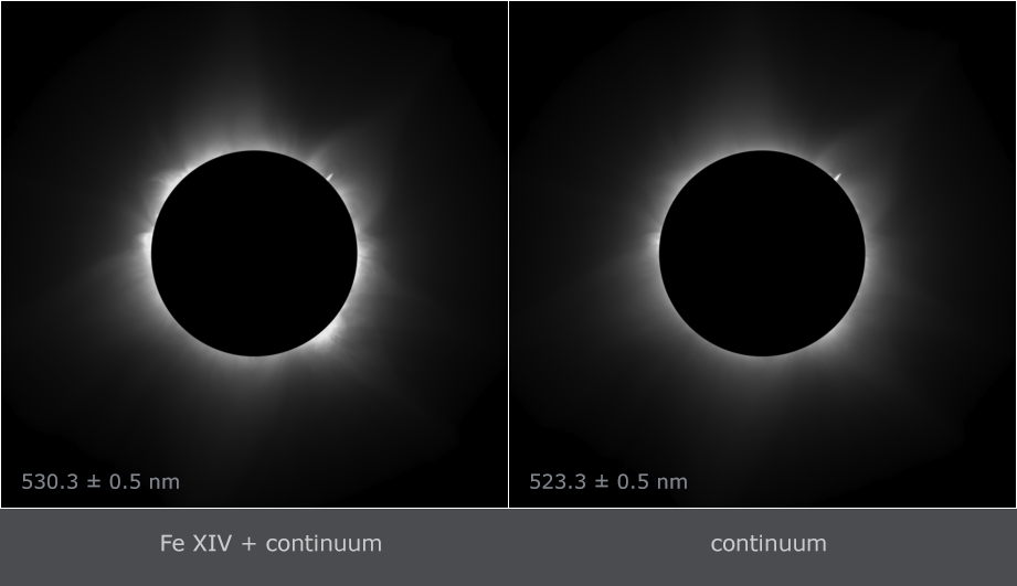 Fe XIV 530.3 nm emission line. The right image was taken through a filter with the transmission band outside