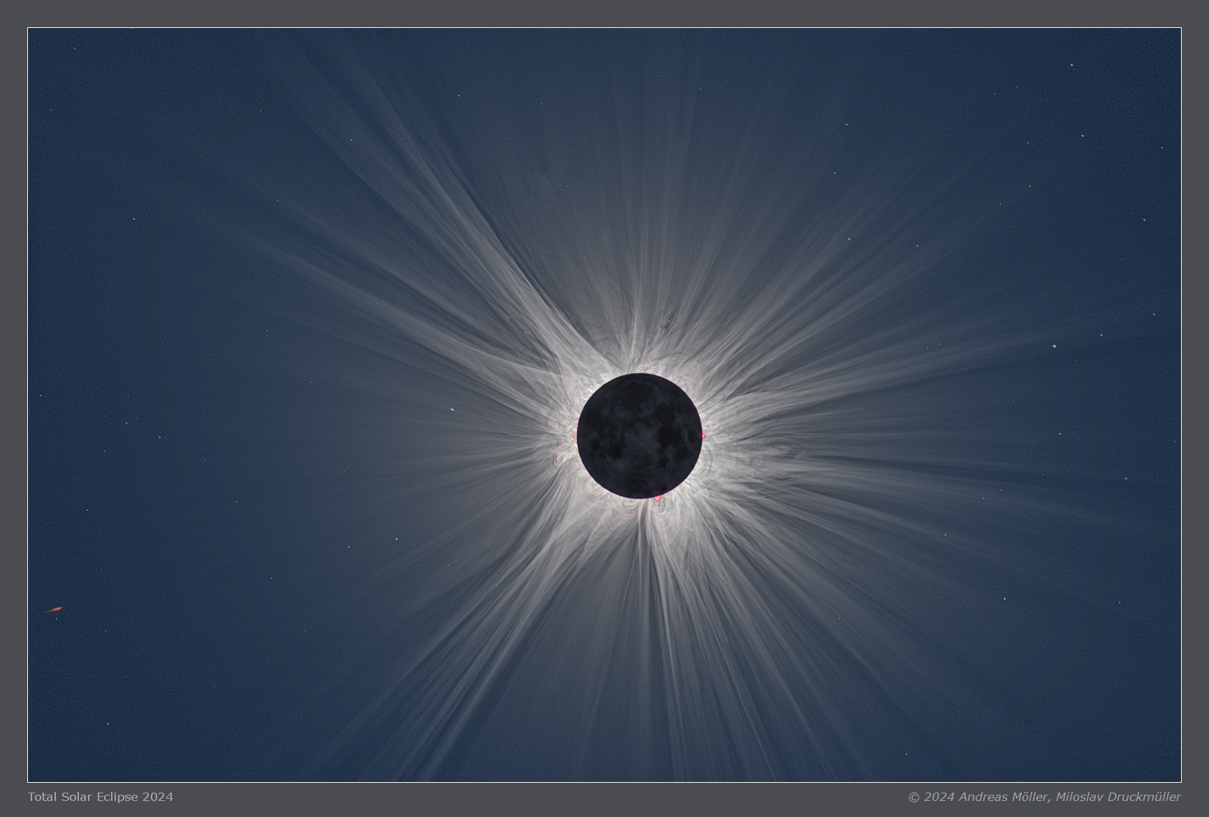 | Processing | Composition of 139 eclipse images. Eclipse images were calibrated by means of dark frames and flat-fields, aligned by means of phase correlation, composed by means of LDIC 6.0 software, processed using Corona 6.0 in order to visualize coronal structures. Final processing was done using ACC 6.1 software. Image processing by Miloslav Druckmüller Images acquired by Andreas Möller |