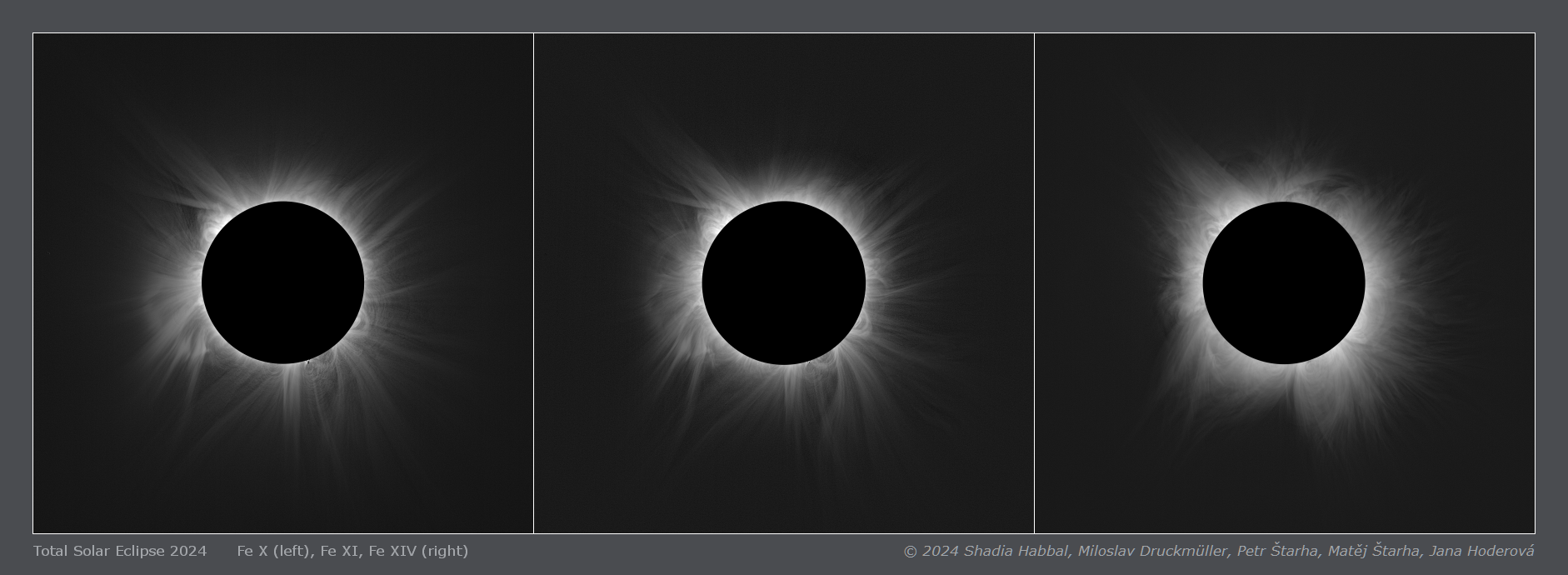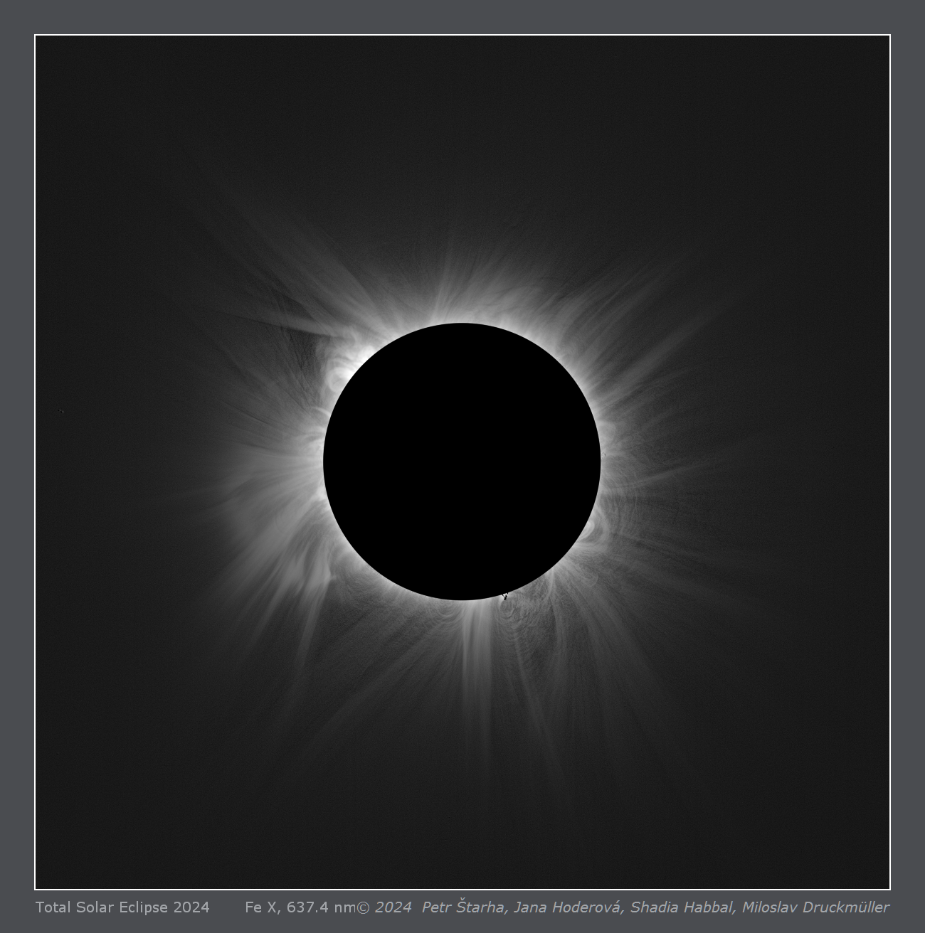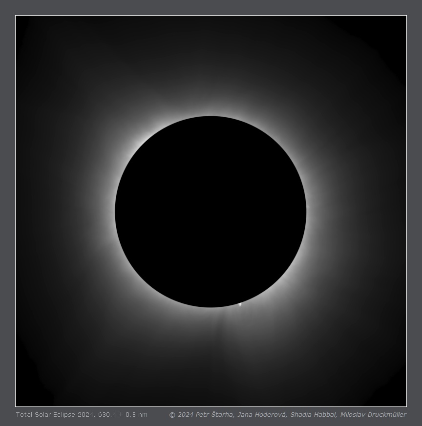 | Processing | Composition of 396 eclipse images (198 on-band and 198 off-band) taken with two cameras. Images were calibrated by means of dark frames and flat-fields, aligned by means of phase correlation, composed by means of LDIC 6.0 software, continuum was removed from Fe X emission by subtracting the off-band images. The resulting image was processed using Corona 5.0 software in order to visualize coronal structures. The final processing was done using ACC 6.1 software. Image processing by Miloslav Druckmüller |