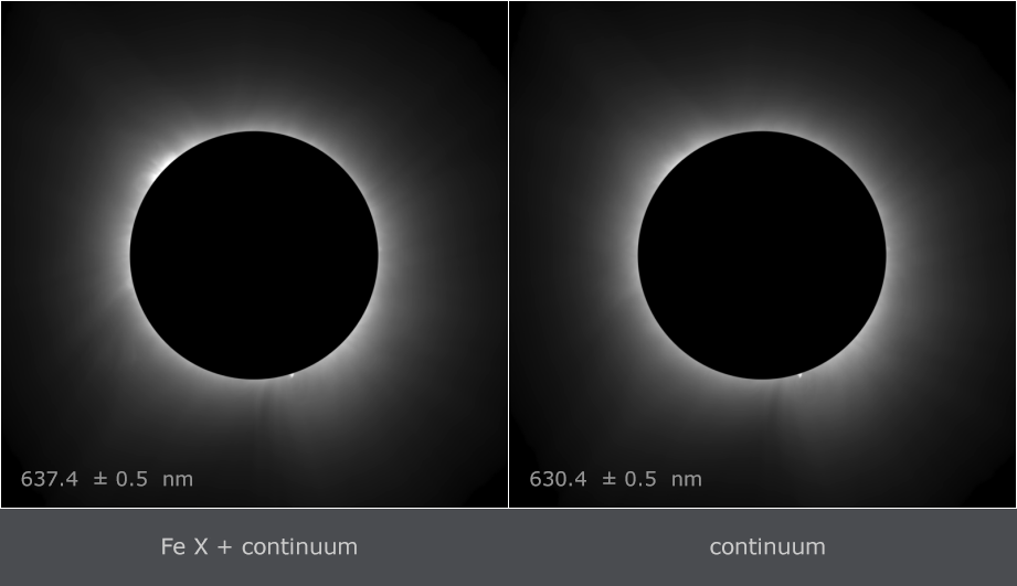 Fe X 637.4 nm emission line. The right image was taken through a filter with transmission band