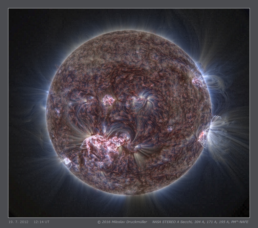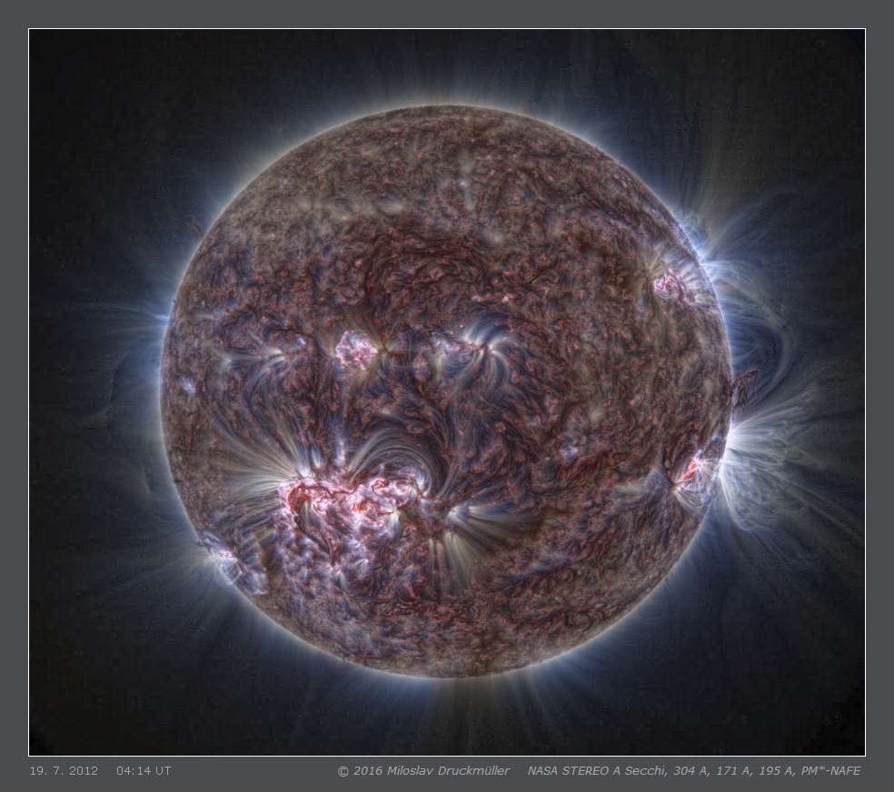 This far side flare arised in the same active region as the flare which released the well known "Super storm" 4 days later. STEREO A spacecraft was in the position in which the flare was directly visible. Following images show the region on 04:14 UT, 06:14 UT, 08:14 UT, 10:14 UT, 12:14 UT. The color mapping of these STEREO images is not identical with PM-NAFE applied to SDO AIA data. The reason is that 211 A channel is not available and it is replaced by 195 A channel.