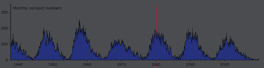 | Note | The graph above the table shows the average values of the relative number of sunspots, in which the red arrow indicates the time of 1980 eclipse. Graph was created according to data from Sunspot Index Data Center, Brussels. |