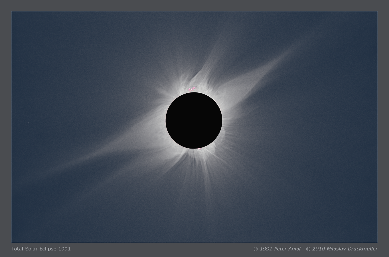 | Processing | Composition of 21 images, (1) 13 images 24×36 mm, (2) 8 images 6×6 cm. Images were aligned by means of phase correlation, composed by means of FilmCMP 2.0 software, processed using Corona 4.1 in order to visualize coronal structures. Final processing was done using ACC 6.1 software. Image processing by Miloslav Druckmüller |