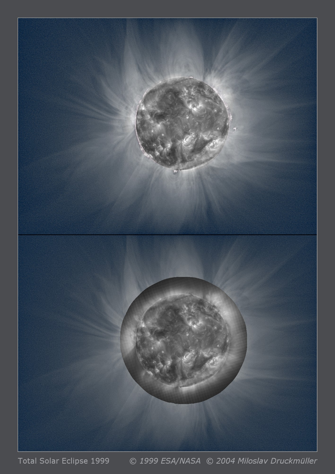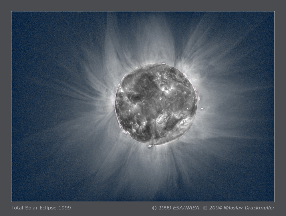 | Processing | Composition of 21 images processed by means of Corona 3.0 merged to SOHO EIT image. Image processing by Miloslav Druckmüller |