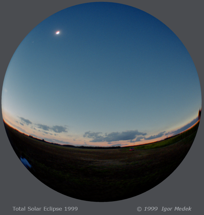 This photograph was taken during totality using a fish-eye lens with a field of view of about 160°. The