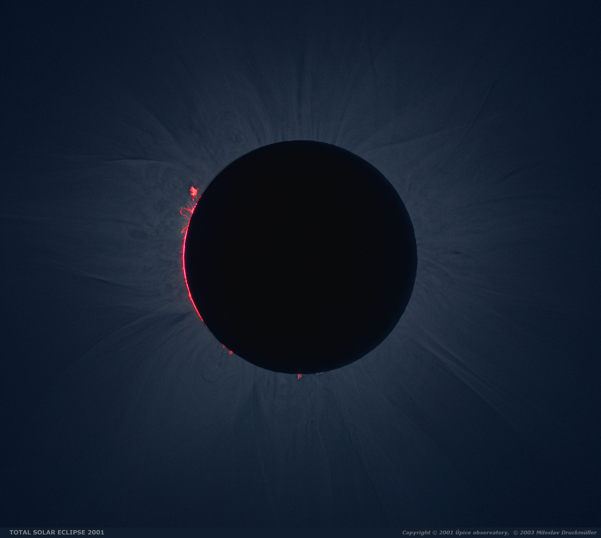 Even if the chromosphere and the prominences are not as bright (in visible light) as the solar photosphere is they are still bright enough to be impossible to obtain good image of the chromosphere, the prominences and the inner corona in a single film frame. On the contrary human vision manages easily this task. Again it is necessary to combine several images taken with various expositions. One image of the chromosphere and the prominences taken shortly after the second contact was composed with eight images sum processed by means of adaptive kernel convolution using Corona 2.0 software.