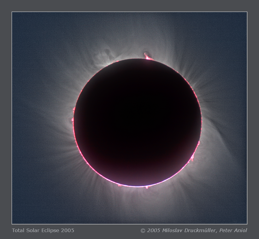 This image is the result of numerical processing of 22 images taken by Miloslav Druckmüller and 8 images taken by Peter Aniol. The inner part of the corona was reconstructed mainly from images taken by Peter because he used longer focal length (600 mm) and the digital camera with chip having smaller sensors (Canon EOS 20D). The more distant part of the corona was reconstructed mainly using images taken by Miloslav, who used shorter focal length (400 mm) and camera with bigger sensors (Canon EOS 1D Mark II), which have lower noise. The red fog is H-alpha radiation of the solar chromosphere diffused by a cirrus cloud.
