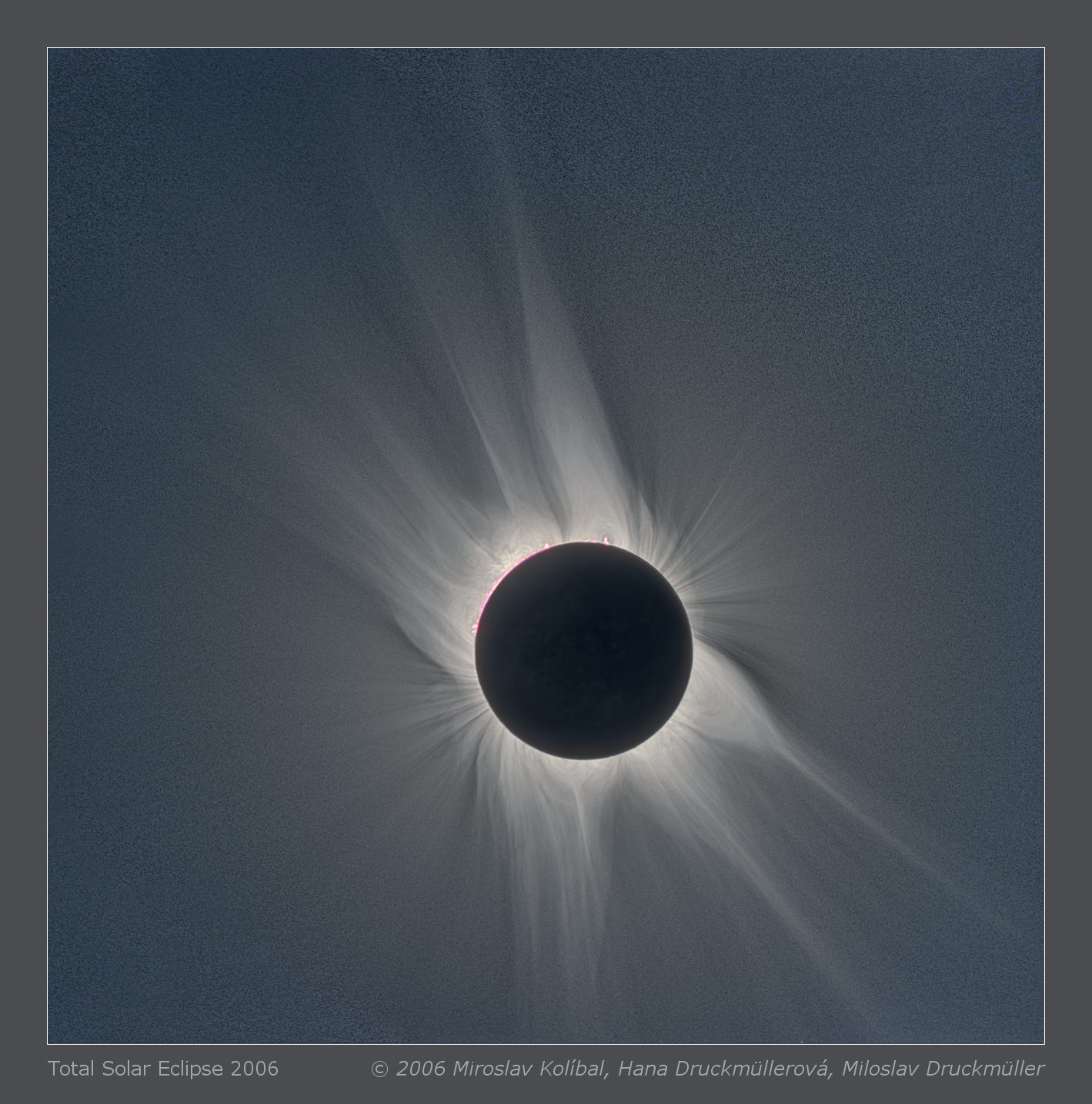 | Processing | Composition of 102 images (63 D, 39 K). Eclipse images were aligned by means of phase correlation, composed using of LDIC 4.0 software, processed using Corona 4.0 in order to visualize coronal structures. Final processing was done using ACC 6.0 software. Image processing by Miloslav Druckmüller and Hana Druckmüllerová |
