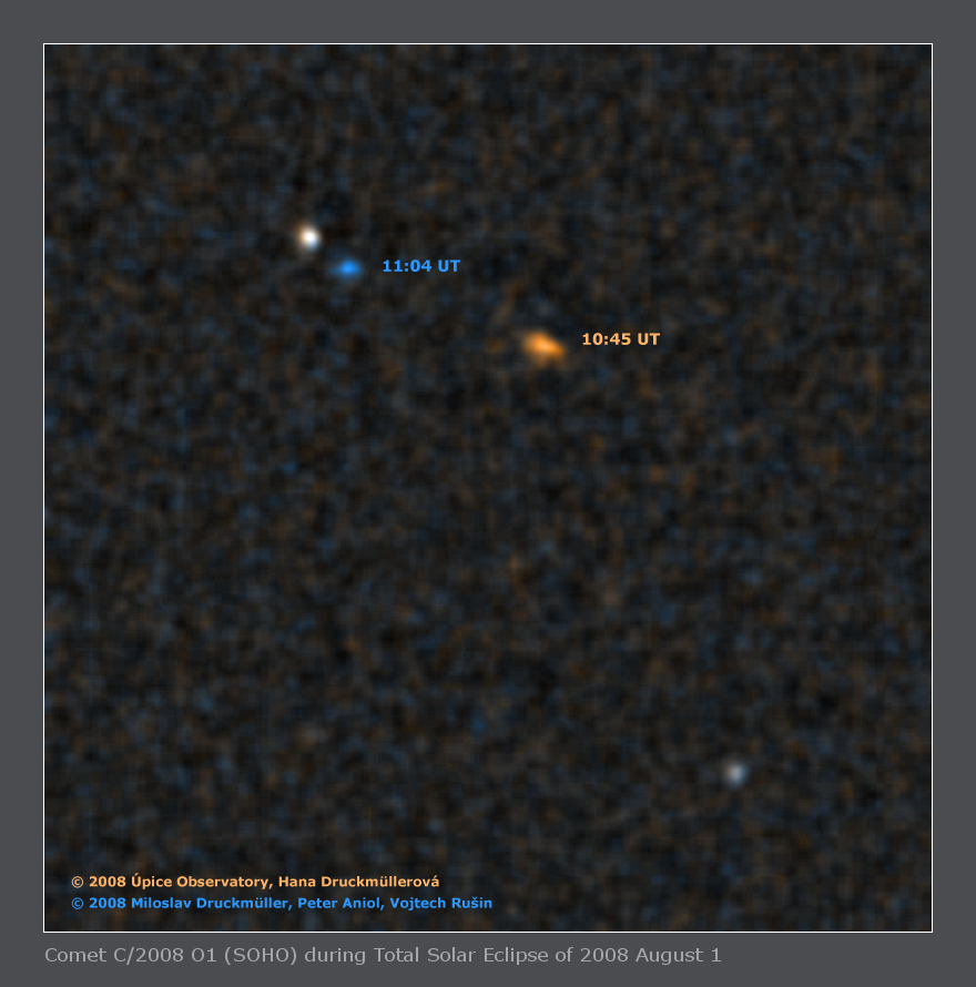 Sungrazing cometAccording to MPEC 2008-O67, the comet was 1.04 AU far from us and only 0.05 AU far from the solar center during our observation. The bright star near the comet is of 8.3 magnitude and has coordinate J2000 RA: 8h39m31.51s, DE: +17°28'41.5" (TYC1392-00854-1 Tycho 2 catalogue). The second little bit fainter star at the bottom right is of 9.0 magnitude and its coordinate are J2000 RA: 8h38m44.19s, DE: +17°14'56.5" (TYC1392-00425-1 Tycho 2 catalogue). See the image with coordinate grid. You may see the comet images taken in Russia and Mongolia also in the form of animations with wider and narrower field of view. Acknowledgement I identified the comet thanks to information from Michal Kusiak, Martin Mašek and Dalibor Hanžl.