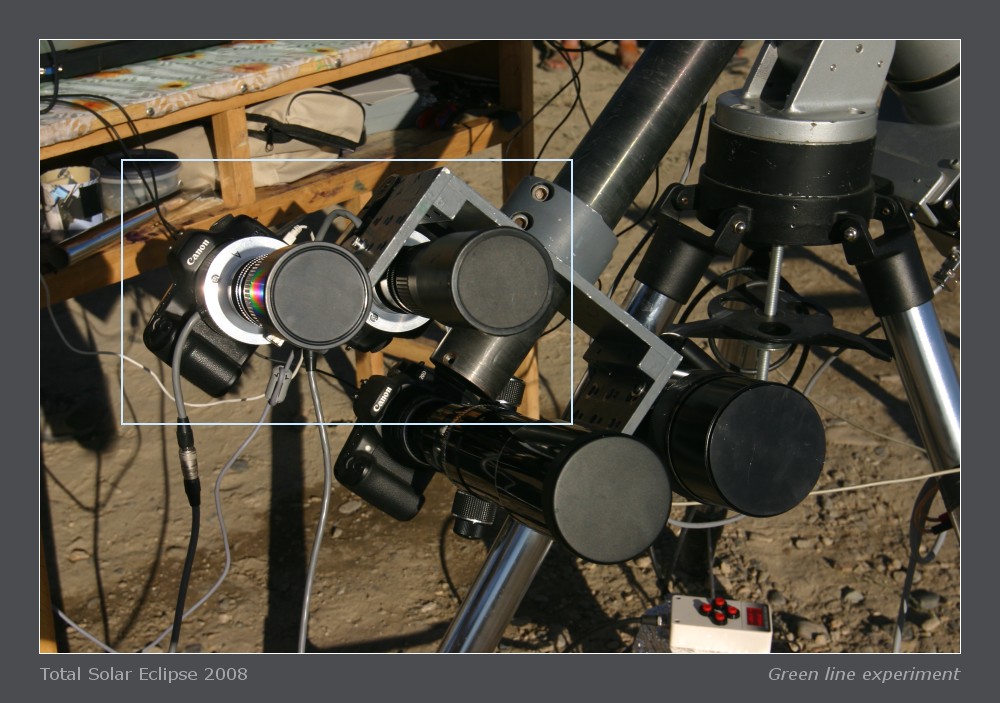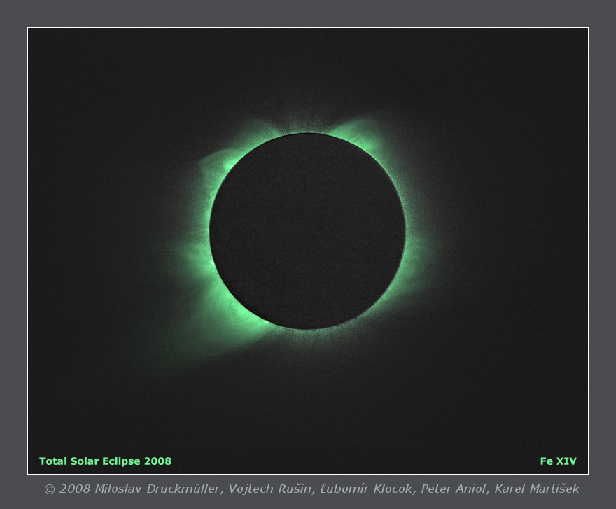This image shows Fe XIV emission, which visualizes hot areas in the solar corona with temperature about 1.8 MK. The resulting image was made from two sets of images taken with two Canon EOS 5D cameras. The first one (on-line camera) was equipped with a narrow-band filter with center wavelength 530.2 nm and bandwidth 0.15 nm. The second camera (off-line camera) was equipped with a narrow-band filter of the same bandwidth and center wavelength 529.1 nm. Both used filters were stabilized at temperature of 45.0°C. After precise calibration, the images taken with the off-line camera were subtracted from images taken with the on-line camera in order to remove the continuum radiation. Therefore the resulting image contains Fe XIV radiation only. The image is presented in the color which corresponds for human vision with 530 nm. See the following pages for more information about our green line experiment.