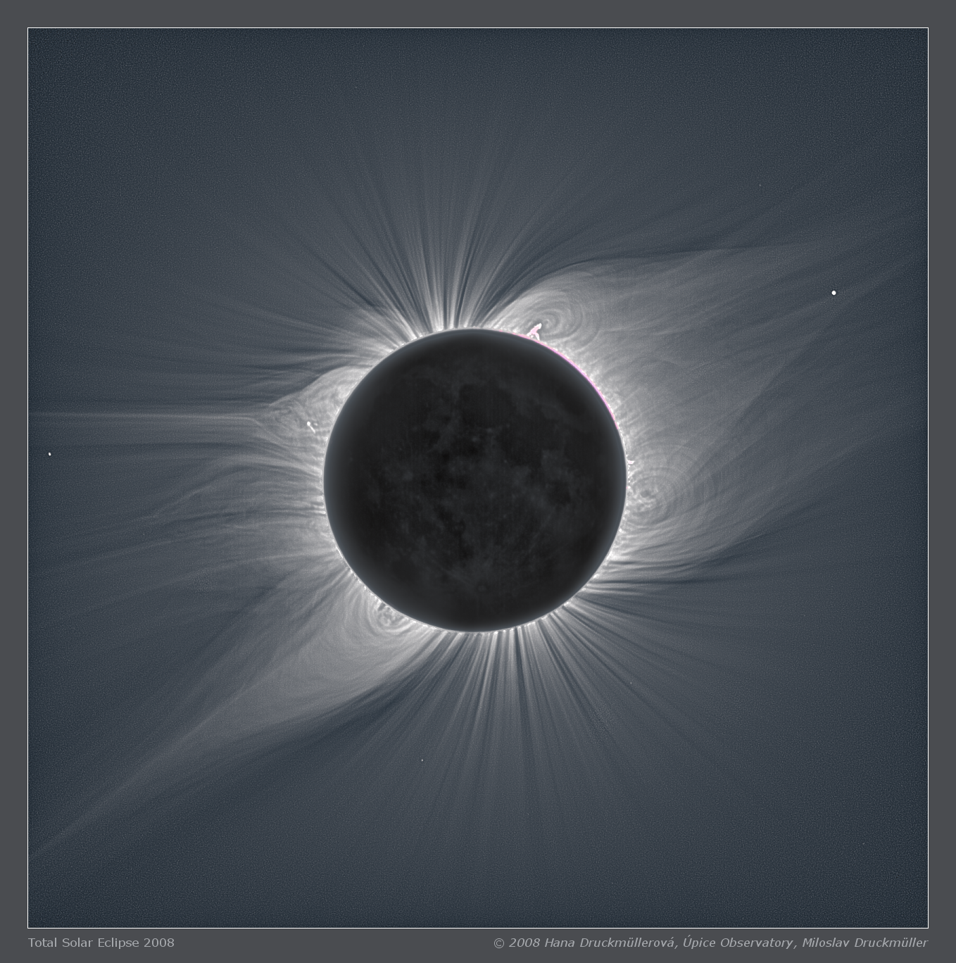 | Processing | Composition of 56 (D) and 30 (U) images. Eclipse images calibrated by means of dark frames and flat-fields, aligned by means of phase correlation, composed by means of LDIC 5.0 software, processed using Corona 4.1 in order to visualize coronal structures. Final processing was done using ACC 6.1 software. Image processing by Hana Druckmüllerová and Miloslav Druckmüller |
