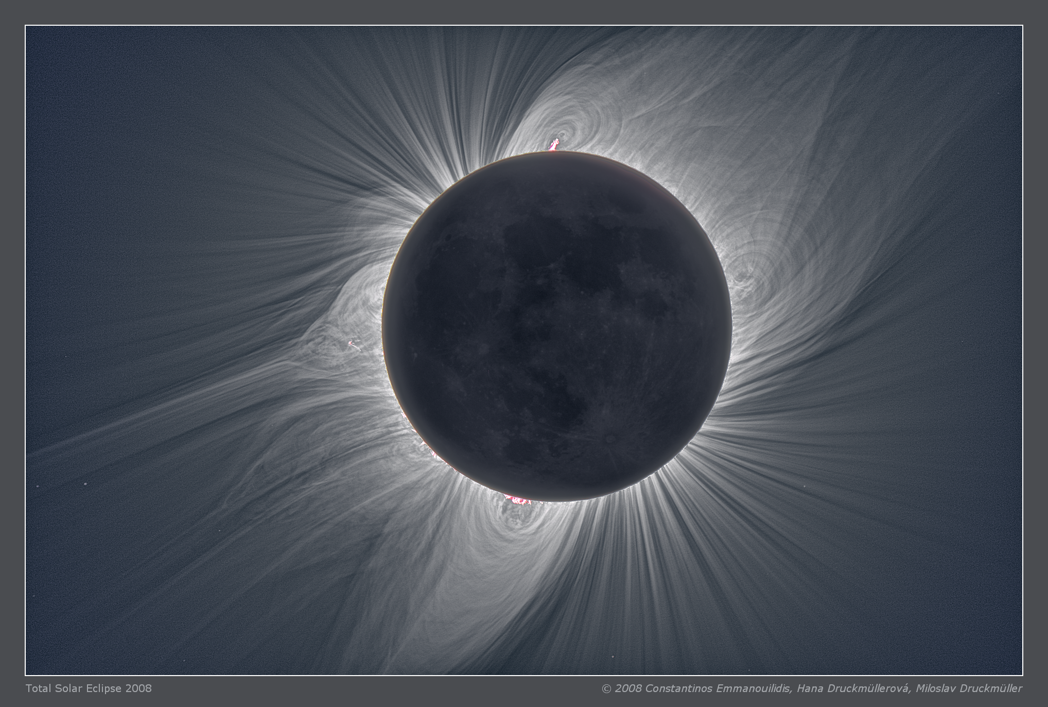 | Processing | Composition of 37 images. Eclipse images calibrated by means of dark frames and flat-fields, aligned by means of phase correlation, composed by means of LDIC 5.0 software, processed using Corona 4.1 in order to visualize coronal structures. Final processing was done using ACC 6.1 software. Image processing by Hana Druckmüllerová and Miloslav Druckmüller |