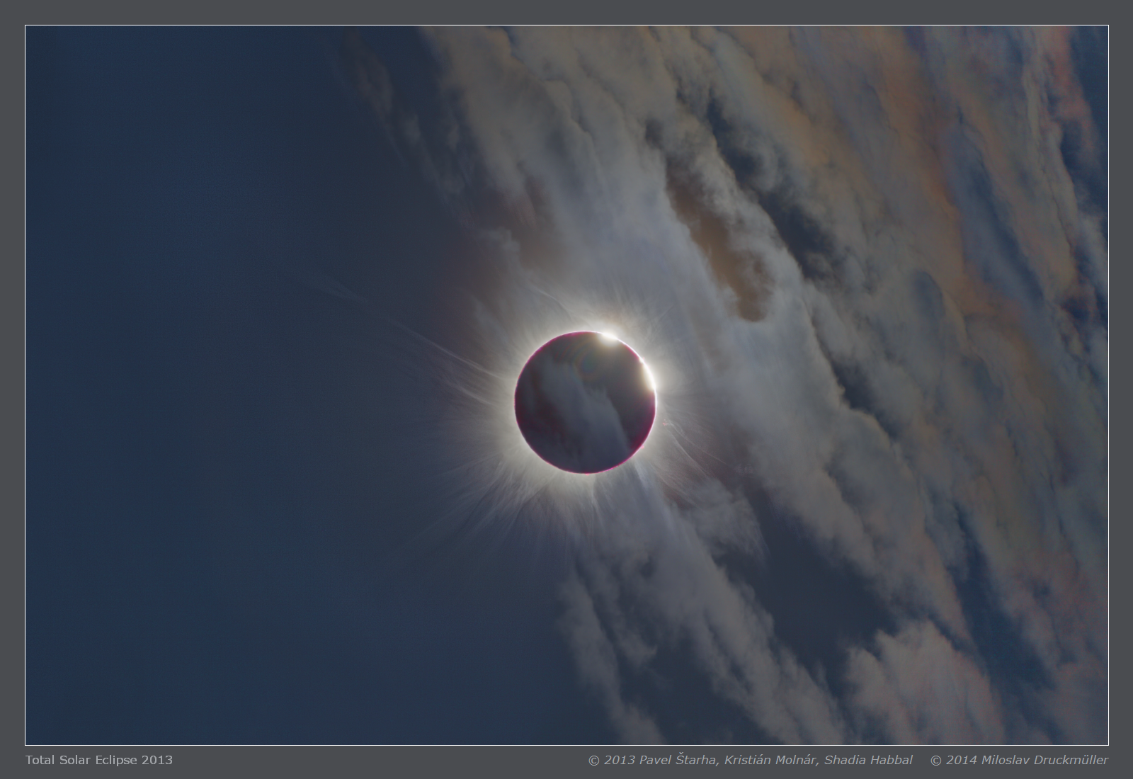 | Processing | Composition of 54 eclipse images - 25 images (1), 22 images (2), 6 images (3), 1 image (4). Digital eclipse images were calibrated by means of large number of dark frames and flat-fields, aligned by means of phase correlation, composed by means of LDIC 5.0 software, processed using Corona 4.1 in order to visualize coronal structures. Final processing was done using ACC 6.1 software. Image processing by Miloslav Druckmüller |