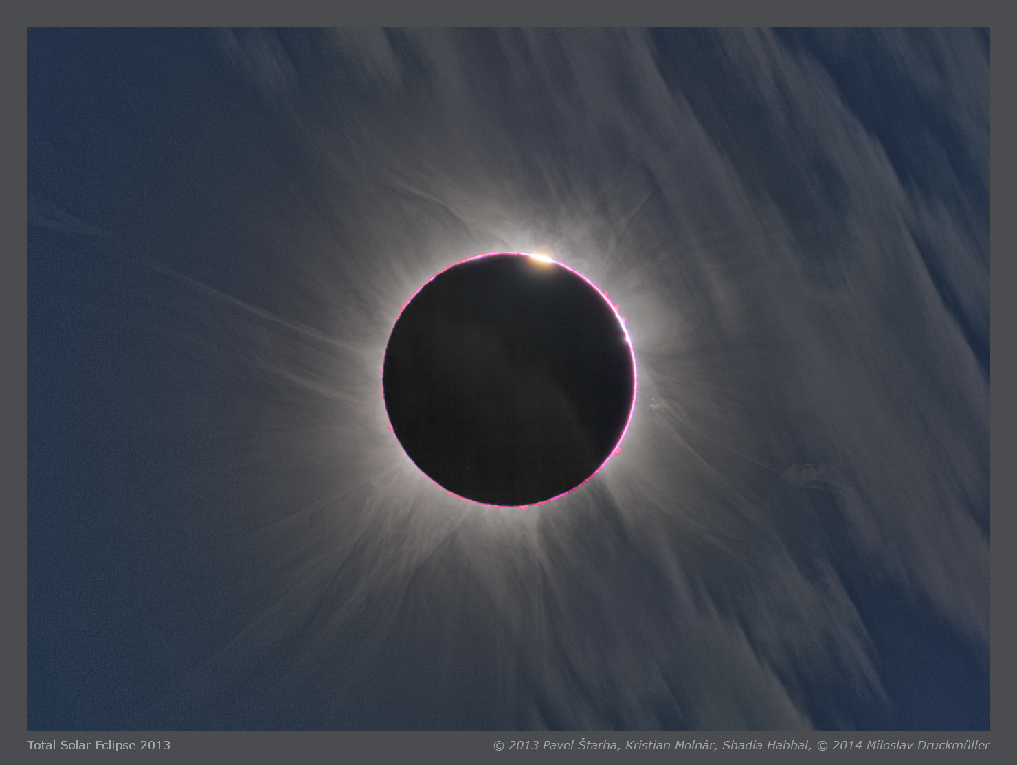 | Processing | Composition of 52 eclipse images - 24 images (1), 22 images (2), 6 images (3). Digital eclipse images were calibrated by means of large number of dark frames and flat-fields, aligned by means of phase correlation, composed by means of LDIC 5.0 software, processed using Corona 4.1 in order to visualize coronal structures. Final processing was done using ACC 6.1 software. Image processing by Miloslav Druckmüller |