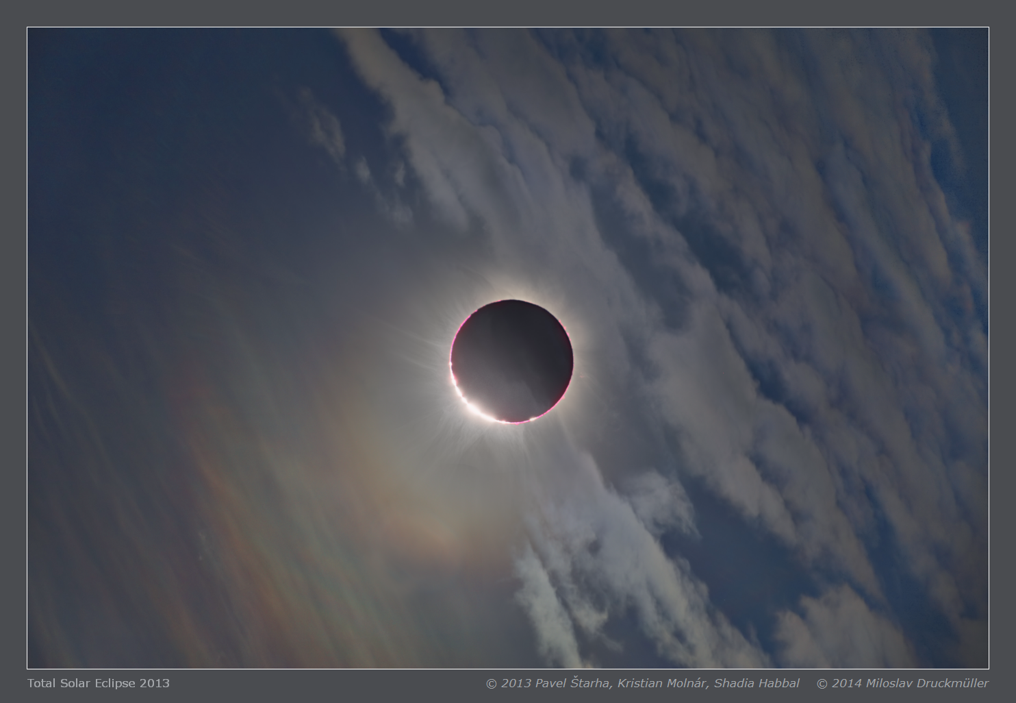 | Processing | Composition of 54 eclipse images - 25 images (1), 20 images (2), 8 images (3), 1 image (4). Digital eclipse images were calibrated by means of large number of dark frames and flat-fields, aligned by means of phase correlation, composed by means of LDIC 5.0 software, processed using Corona 4.1 in order to visualize coronal structures. Final processing was done using ACC 6.1 software. Image processing by Miloslav Druckmüller |