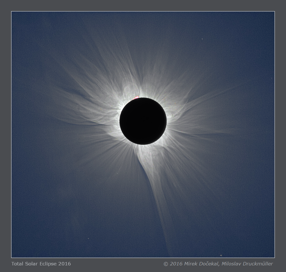 | Processing | Composition of 34 eclipse images. Eclipse images were calibrated by means of dark frames and flat-fields, aligned by means of phase correlation, composed by means of LDIC 5.0 software, processed using Corona 4.1 in order to visualize coronal structures. Final processing was done using ACC 6.1 software. Image processing by Miloslav Druckmüller |