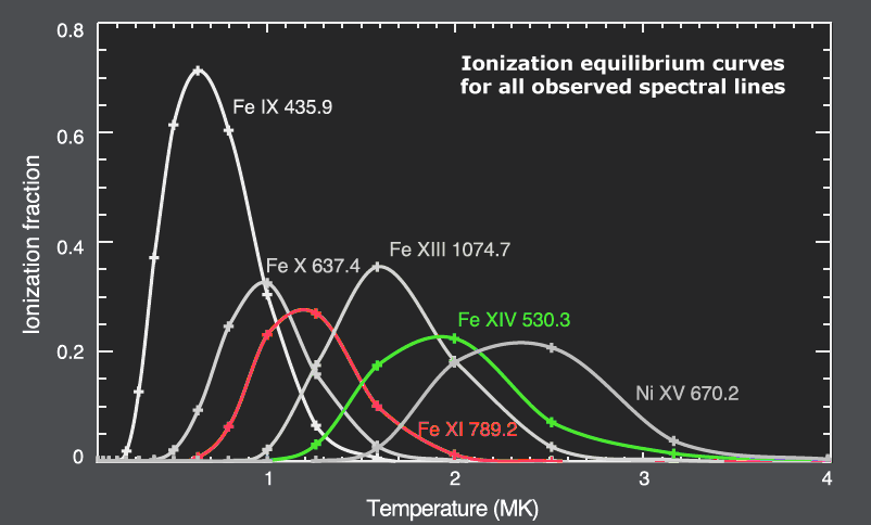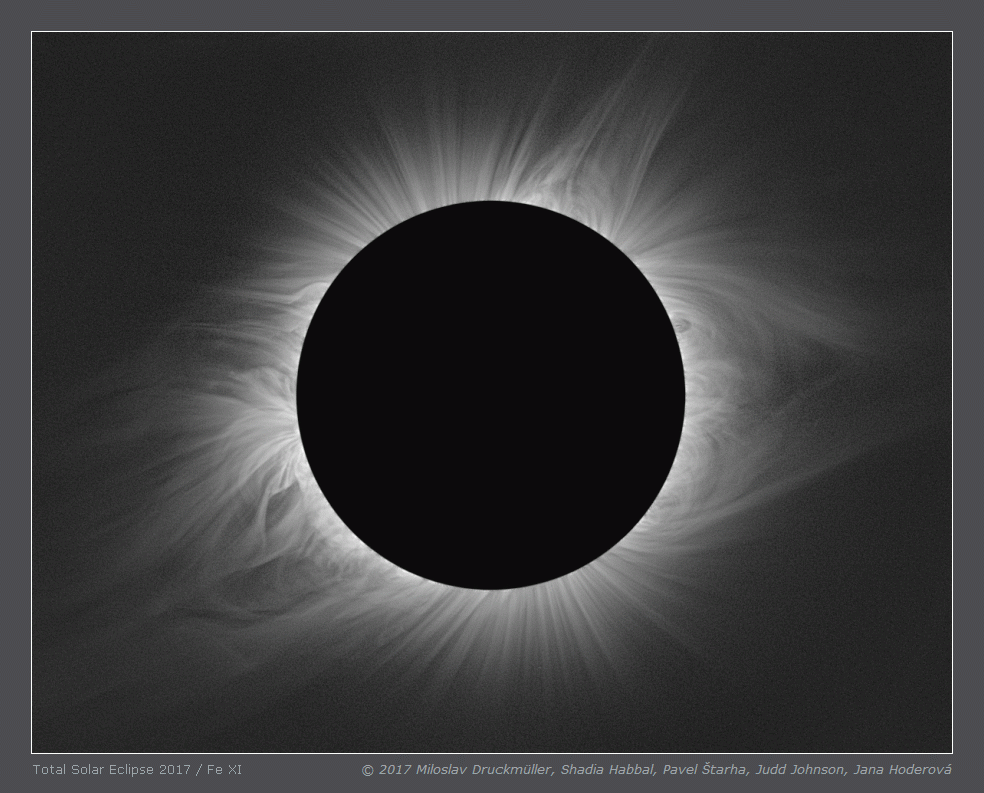 This animation of Fe XI image and Fe XIV image shows a significant difference between the distribution of these ions in the solar corona. Whereas Fe XIV ions visualize predominantly the solar magnetic field lines which are closed in the nearest vicinity of the Sun, Fe XI conversely visualizes mainly the magnetic field lines which are opened to interplanetary space and they are closed somewhere very far from the Sun.