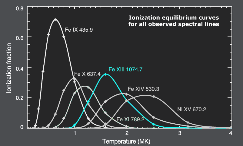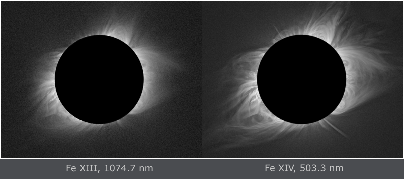 Fe XI (789.2 nm), Fe XIII (1074.7 nm), Fe XIV (530.3 nm) and