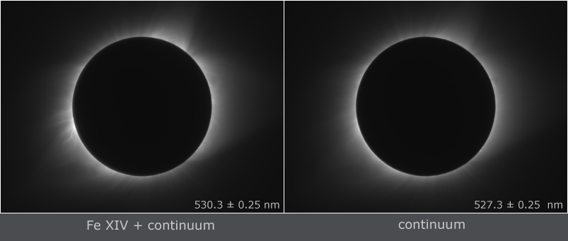 | Processing | Composition of 24 eclipse images (12 On-band and 12 Off-band) taken with two cameras. Images were calibrated by means of dark frames and flat-fields, aligned by means of phase correlation, composed by means of LDIC 6.0 software, continuum was removed from Fe XIV emission by subtracting the Off-band images, than resulting image was processed using Corona 5.0 software in order to visualize coronal structures. Final processing was done using ACC 6.1 software. Image processing by Miloslav Druckmüller |