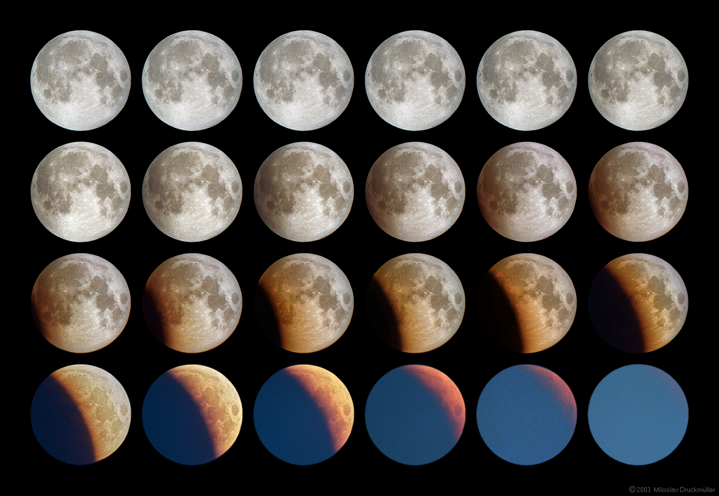 Total lunar eclipse on May 16, 2003 was not completely visible in the Czech Republic (central Europe) because the times of moonset, sunrise and total eclipse beginning were nearly the same. Regardless, the visible part of the eclipse was very interesting. The start of penumbral phase was at 01:07 UT (between images 1,2). The partial eclipse started at 02:03 UT (between images 12,13), i.e. first two rows represent the penumbral eclipse, following two rows show the partial eclipse. Approximately at 02:30 UT (04:30 local time) the dawn begun to influence the observing significantly. About at five o'clock local time (03:00 UT) the Moon disappeared on blue sky near the horizon. The total eclipse started 03:14 UT. The moonset at 03:21, of course, was not visible because the dark Moon hidden in umbral shadow had no chance against day time blue sky.