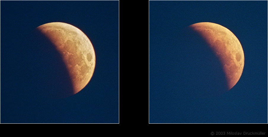 The second half of partial eclipse was influenced by daybreak and Moon's approaching the horizon. In spite of that it was still possible to suspect the totally eclipsed part of the Moon.
