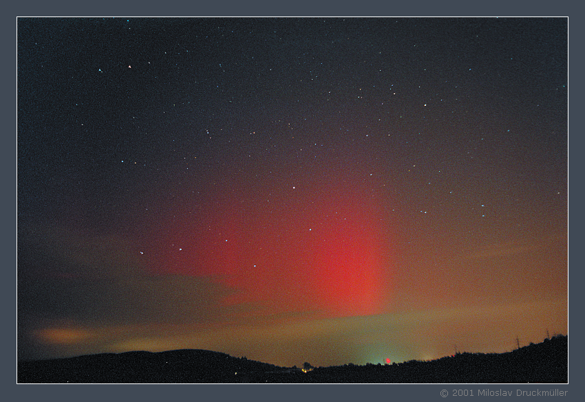![]() Obr 1. 23:20 LČ Zpočátku dobré pozorovací podmínky se začaly rychle zhoršovat a v 00:00 LČ bylo již téměř úplně zataženo. V tuto dobu se objevila mimořádně jasná červená polární záře viditelná na SZ několika menšími dírami v jinak souvislé oblačnosti (obr. 2.).