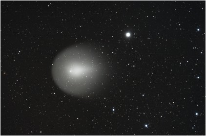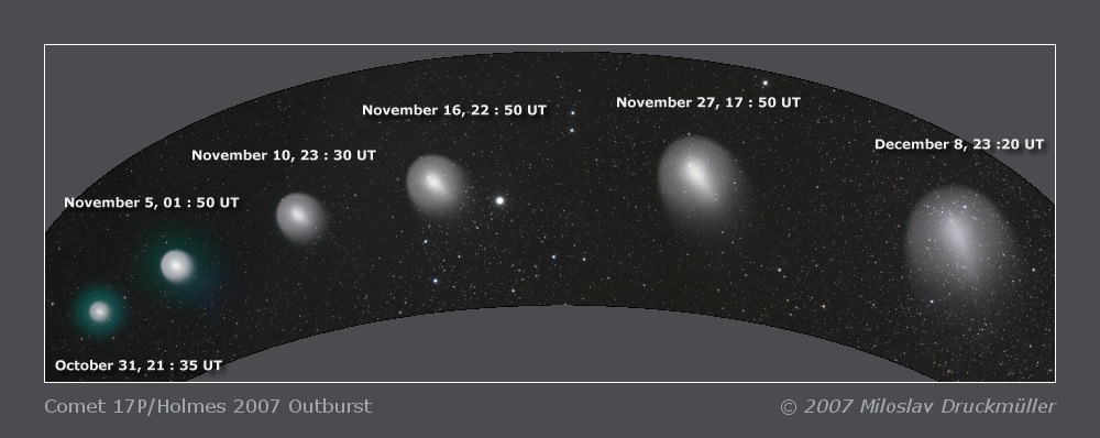 If anybody told me before October 24th 2007 that a comet weaker than 17th magnitude would be visible the next day with naked eyes, I would have only two explanations for that - a silly joke or a lovely fairytale. The Holmes comet managed it and it was not only visible with naked eyes but it nearly reached 2nd magnitude, i.e. it brightened about half million times in less than 24 hours. After that the comet brightness was fading only very slowly. One month after the outburst the comet was of about 3rd magnitude and still an easy naked eye object. Two month after the outburst (Christmas 2007) the brightness slightly decreased to about magnitude 3.5 and even if the comet became less contrast because of increasing size it was visible well without telescope. During January 2008 the comet was fading to about 4th magnitude and carried on fading very slowly. All the time the comet was in Perseus constellation (see this image).